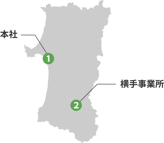 | 所在地 | 本社秋田県秋田市寺内字蛭根85-38 (Google map TEL:018-888-2388 FAX:018-888-2351 横手事業所秋田県横手市杉沢字中杉沢511-4(Google map FAX:0182-38-8910 ![]() |